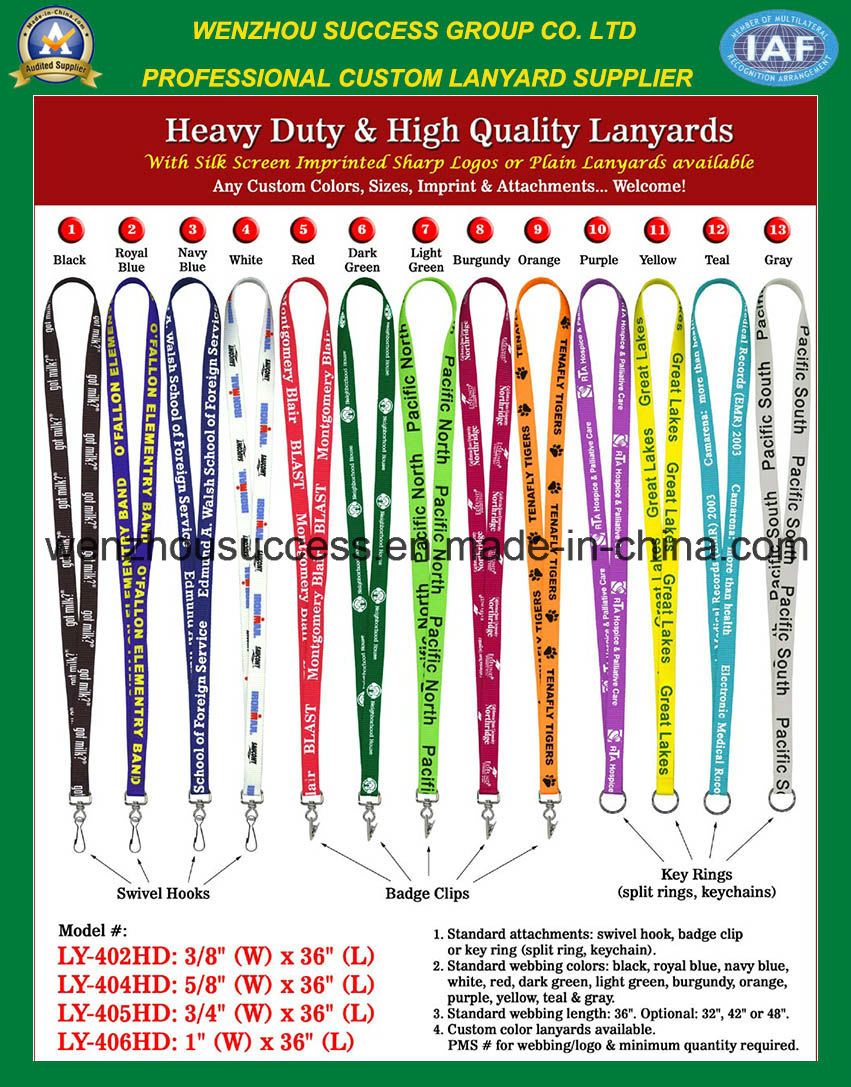 Custom lanyards have become one of the most common and effective methods to advertise a business or promote a particular cause or campaign. Lanyards provide an easy way to carry any small, important items ranging from ID badges to keys to cell phones. Companies and organizations across the world use custom lanyards as promotional products simply because they're an item people use every day. What better way to advertise your business than by printing your name or logo on an item people rely on so often? We're committed to offering a wide selection of custom lanyards that meet every need. We carry multiple styles and sizes, available in hundreds of colors to ensure we have what you're looking for. We offer the lowest prices you'll find on the internet, but we do so without sacrificing quality. Order custom lanyards from us with the confidence you'll receive a professionally-made product at a great price! Make WENZHOUSUCCESS your go-to choice for your custom lanyards and we promise to wow you with our great customer service, fast production and delivery, and of course, low prices!